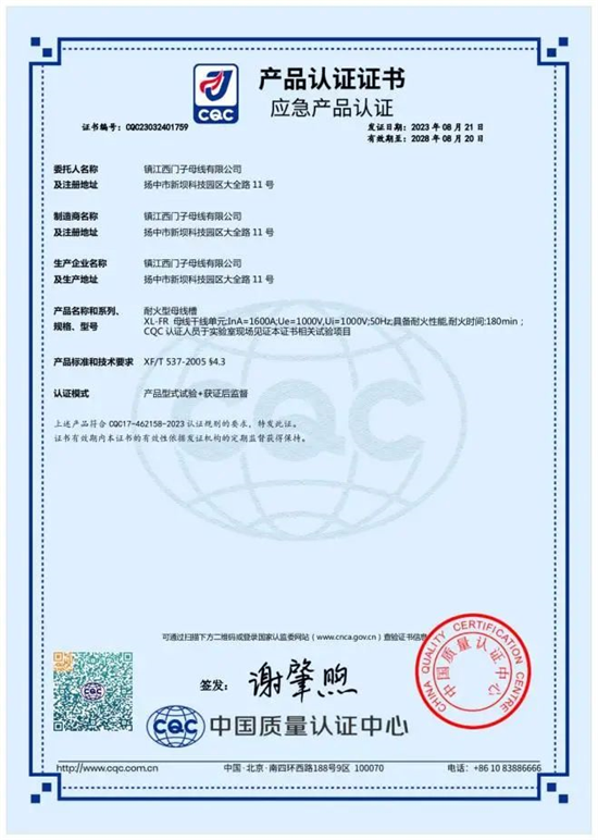 2023年8月22日,中國(guó)質(zhì)量認(rèn)證中心向鎮(zhèn)江西門(mén)子母線(xiàn)有限公司頒發(fā)了首張032016類(lèi)耐火母線(xiàn)槽應(yīng)急產(chǎn)品證書(shū)。這一重要時(shí)刻得到了國(guó)家中低壓配電設(shè)備質(zhì)量檢驗(yàn)檢測(cè)中心(鎮(zhèn)江市產(chǎn)品質(zhì)量監(jiān)督檢驗(yàn)中心)和鎮(zhèn)江西門(mén)子母線(xiàn)有限公司的共同努力與見(jiàn)證。