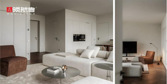 領(lǐng)航者定制柜是北歐色彩哲學(xué)的最佳載體,米白色的客廳定制柜用啞光質(zhì)感避免強光刺眼,與墻面銜接自然,悄悄拉寬空間視覺;餐廚區(qū)的深棕色定制柜保留木紋底色,剛好呼應(yīng)深色木地板,旁邊再搭配淺灰色開放格架,深淺對比間帶出細膩層次。就連角落的定制矮柜,也以“上淺下深”配色貼合整體風(fēng)格,不破壞空間通透感,色彩和諧感全藏在這些定制柜的搭配里。