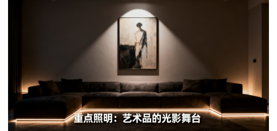 一級(jí)焦點(diǎn)(核心視覺):客廳藝術(shù)掛畫(7W射燈,4000K,CRI97顯色指數(shù))、主臥床頭背景墻(RGBW燈帶,支持色溫與色彩自定義);