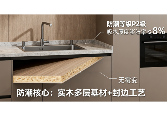 2025年行業(yè)新增“防潮等級”標準,分為P1(基礎(chǔ)防潮)、P2(中度防潮)、P3(高度防潮)三級。廚房應(yīng)優(yōu)先選擇P3級產(chǎn)品,其檢測要求包括:24小時吸水厚度膨脹率≤1.5%,耐煮沸性能(沸水中煮2小時)無開裂分層,甲醛釋放量≤0.03mg/m3(優(yōu)于國標E0級0.05mg/m3)。